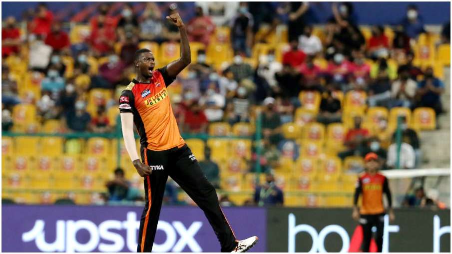 Jason Holder of Sunrisers Hyderabad celebrates the wicket of Shahbaz Ahmed of Royal Challengers Bangalore during the IPL